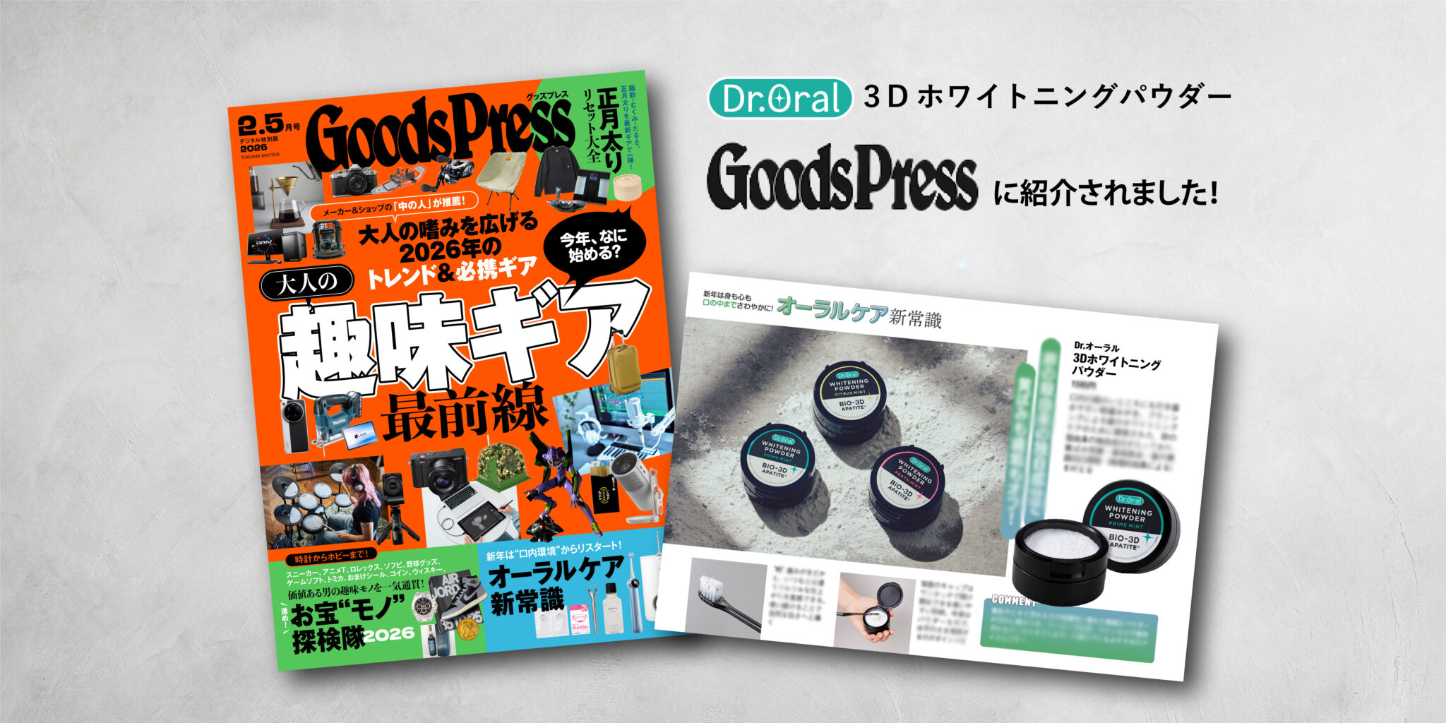 2026.01.09 NEWS 月刊誌「GoodsPress」にDr.Oralが紹介されました! | 株式会社エクロール | 月刊誌「GoodsPress2026年2.5月号(電子版)」の特集『オーラルケア新常識』に、Dr.Oral(ドクターオーラル)3Dホワイトニングパウダーが紹介されました! ドクターオーラルの3 […]
